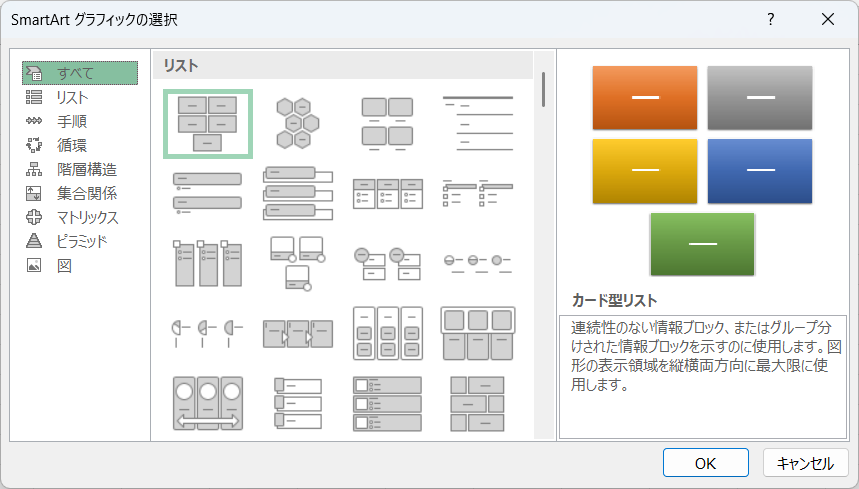 - 「スマートアートグラフィックの選択」ダイアログボックスが表示されます。