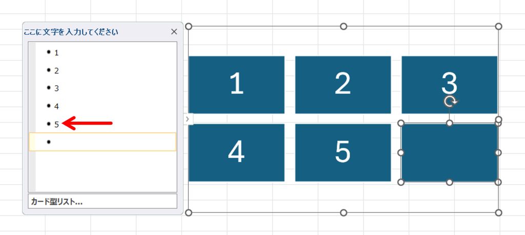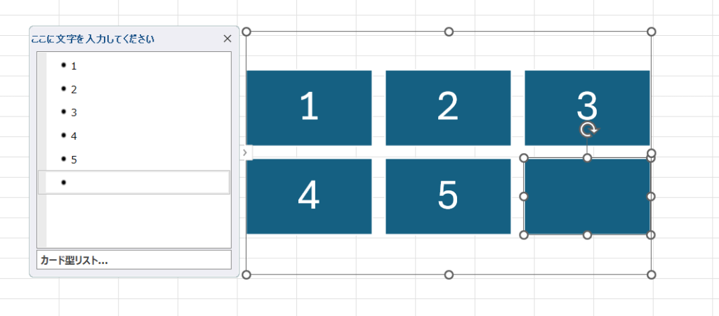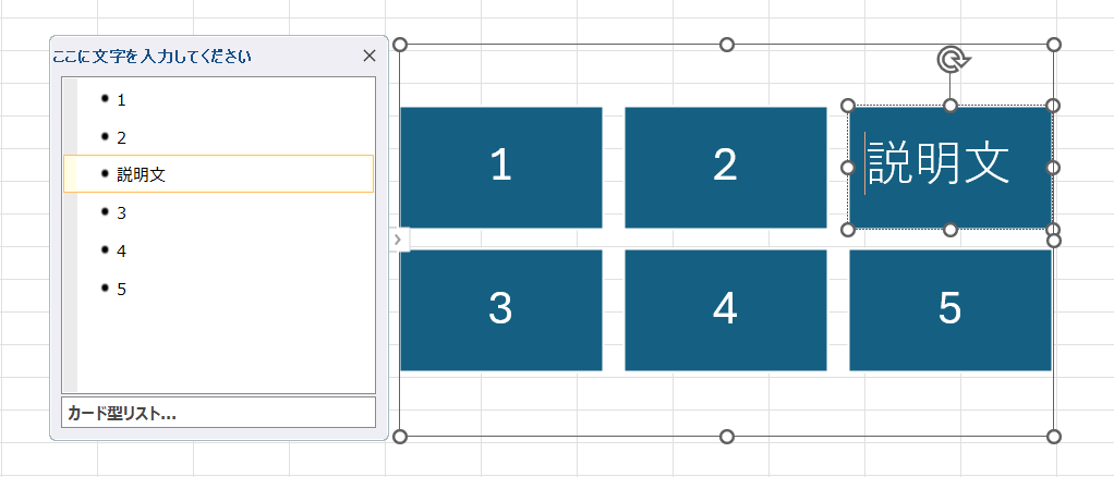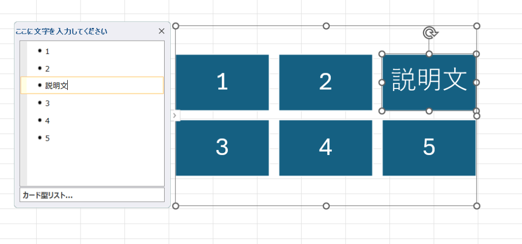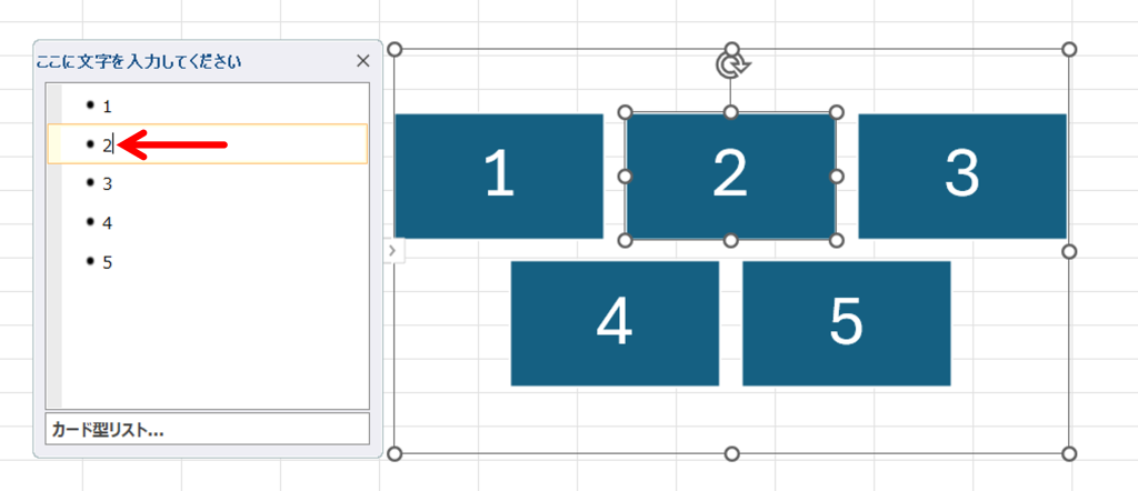右の図形の文字を入れていきます。【テキストウィンドウ】の一番上に【1】と入力します。下矢印キーで移動しますので、続けて、連番を売って行くと、右のスマートアートの図形に反映されます。これが、スマートアート基本操作です。