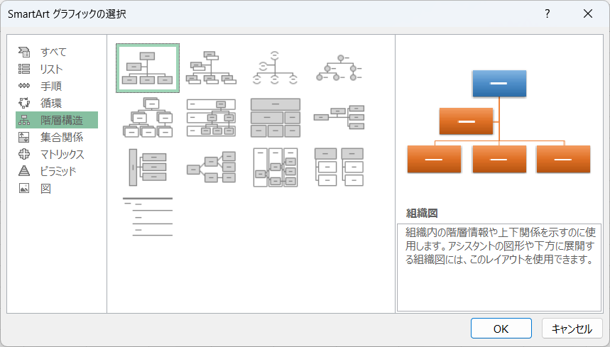 【Smartartのグラフィックの選択】ウィンドウから【階層構造】を選んで、【組織図】をクリックして選択します。