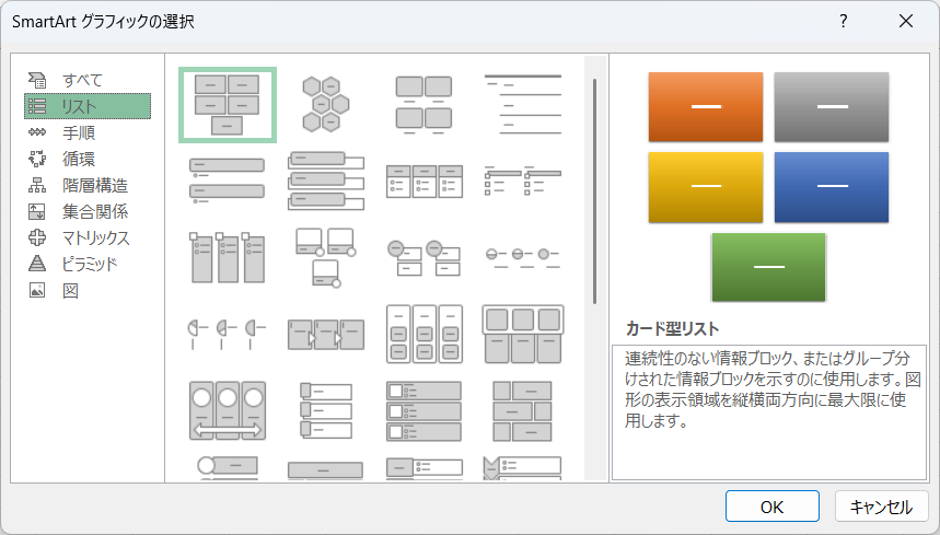 分類を選択すると、右側のウィンドウにその分類に属するスマートアートの具体的なデザインが表示されます。 - 使用したいデザインを選び、「OK」をクリックします。