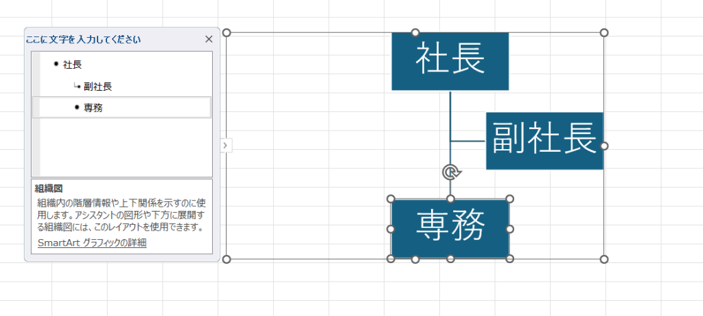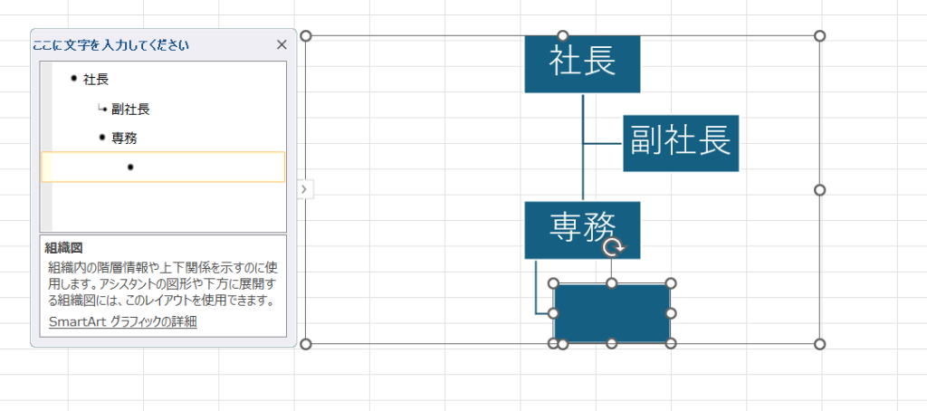 すると、専務からまっすぐ下に、ボックスが表示されます。