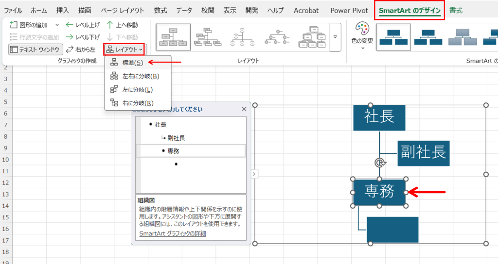 専務のボックスをクリックして、【Smartartのデザイン】タブから【品レイアウト▼】から【標準】をクリックして選択します。