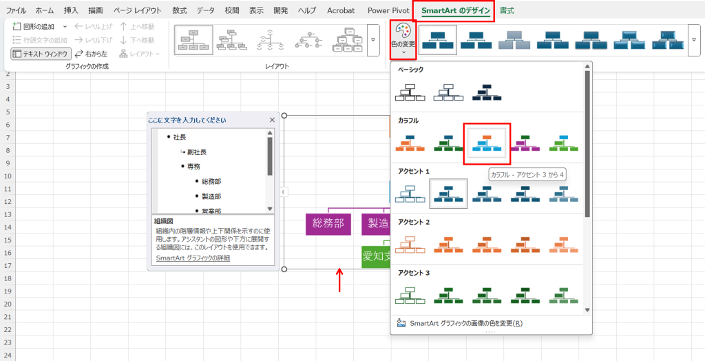 Smartartの画像をクリックして、【Smartartのデザイン】タブから、【色の変更▼】からお好きな色に変更します。ココでは、上記の色に変更します。