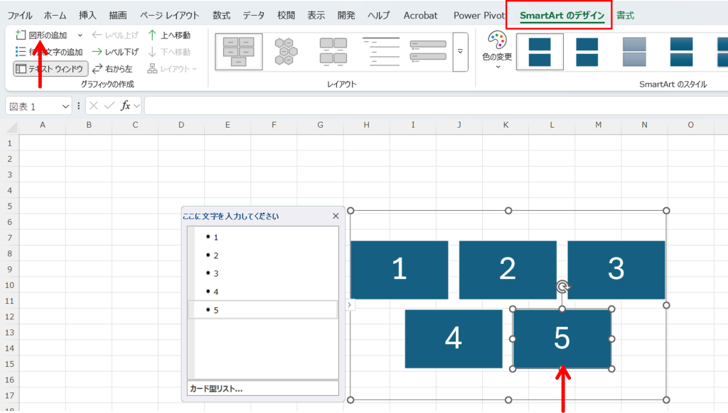 今回は、5番の図形を選択すると、【Smartartのデザイン】タブが表示されるので、【図形の追加】をクリックして選択します。