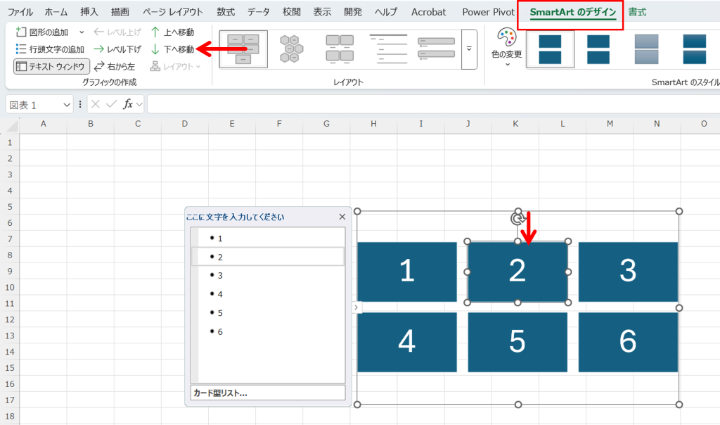 2番のボックスをクリックして、【Smartartのデザイン】タブから上へ移動か、下へ移動をクリックします。
