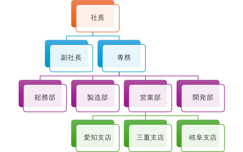 この基本操作を応用して、スマートアートで組織図を作成します。完成版はこの様になっています。