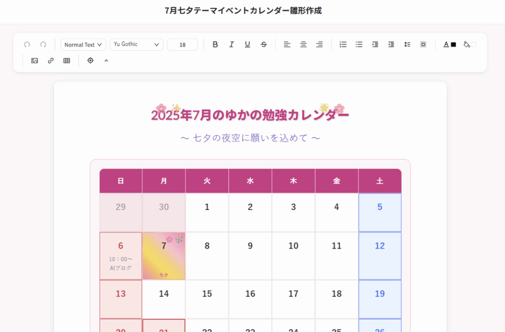 7月のイベントカレンダーの雛形を、七夕のイメージで作って