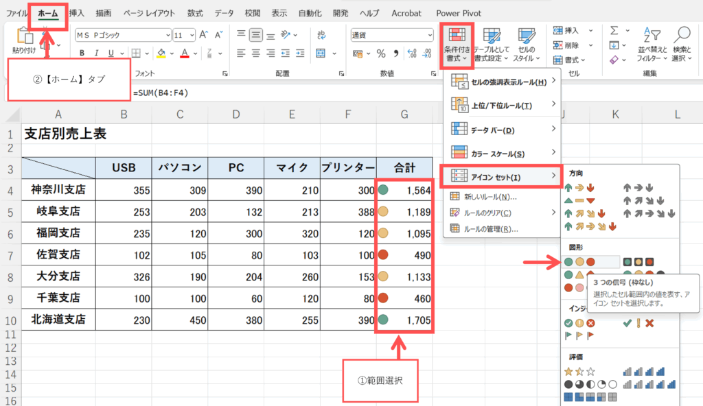 ①アイコンをつけたいデータ範囲を選択します。