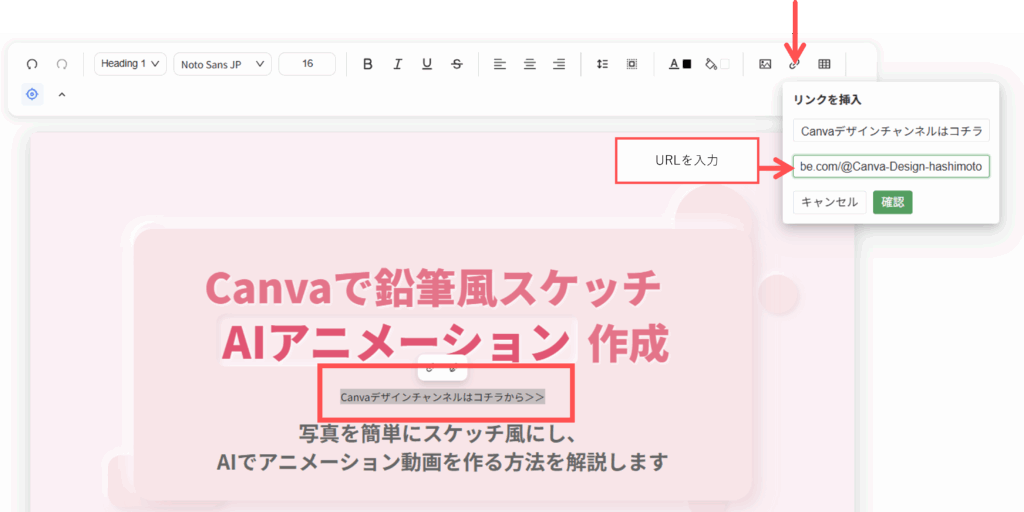 テキストを追加して、【リンク】ボタンを押すと、【リンクを挿入】ポップアップが表示されるのでURLを入力して、【確認】ボタンを押します。