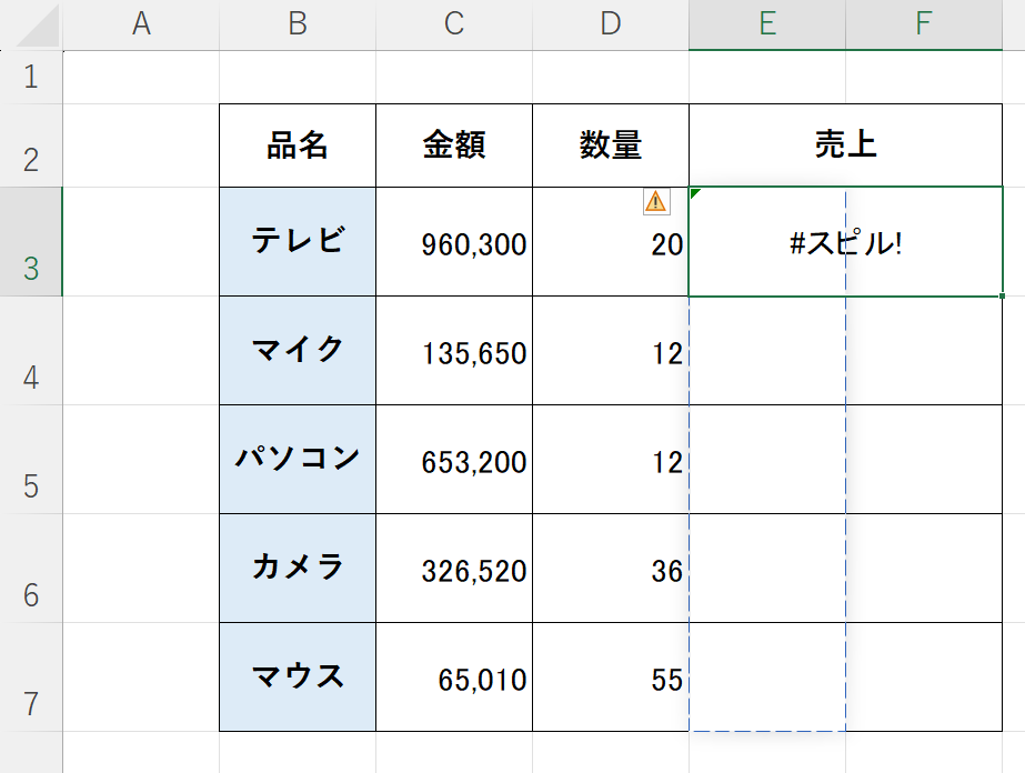 配列を返す関数を使用した場合: FILTER関数、SORT関数、UNIQUE関数、SEQUENCE関数、XLOOKUP関数(複数の結果を返す場合)、TEXTSPLIT関数など、動的配列数式に対応した関数を使用すると、その結果がスピルします。