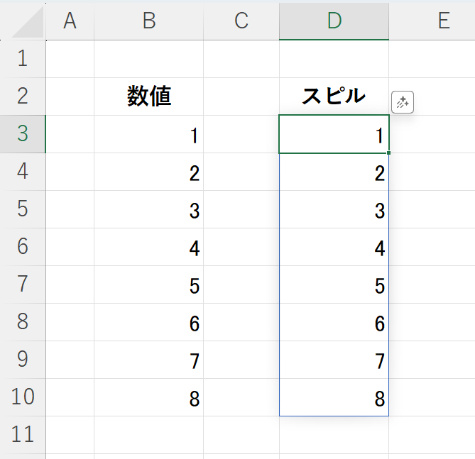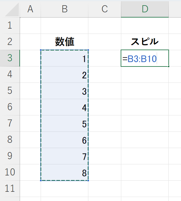 スピルによって結果が表示されたセル範囲は、「スピル範囲」と呼ばれます。スピル範囲の先頭のセル(数式を入力したセル)を選択すると、数式バーに数式が表示され、スピル範囲全体が青い枠線で囲まれて表示されます。スピル範囲内の他のセルを選択しても、数式バーには数式は表示されず、薄いグレーで表示されます。これは、それらのセルが数式の実体ではなく、先頭のセルの数式の結果として「溢れ出た」ものであることを示しています。