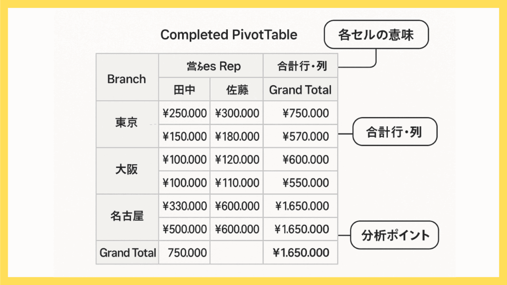 営業データの各項目が、ピボットテーブルのどのフィールドに対応するかを理解することが重要です