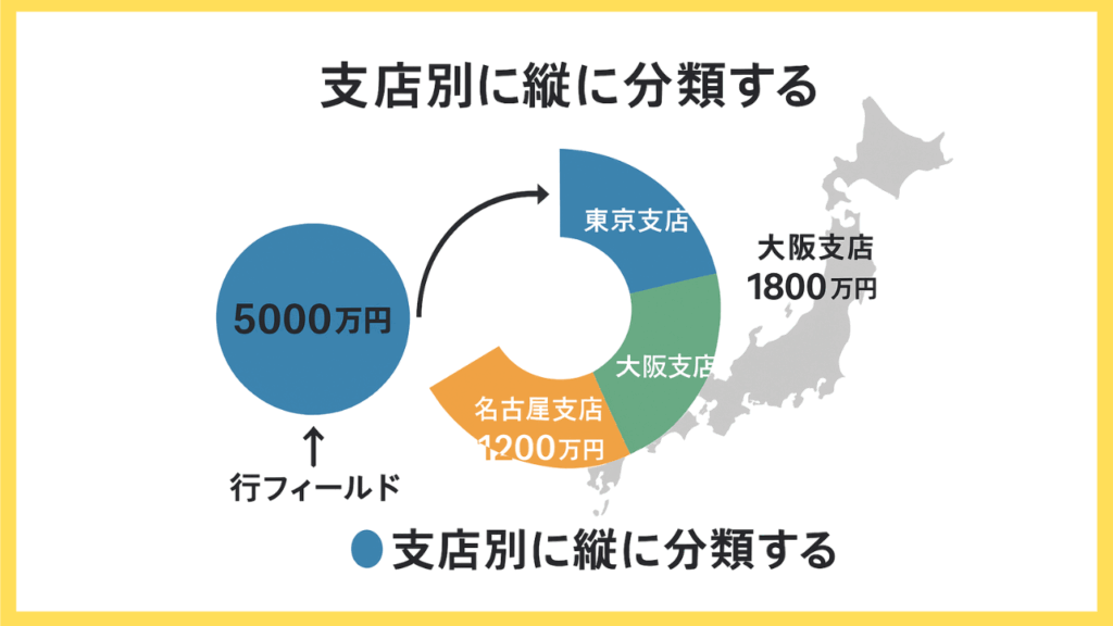 5000万円という一つの塊を、今度は「支店別」に分けてみます。これが「行で分類する」ということです。