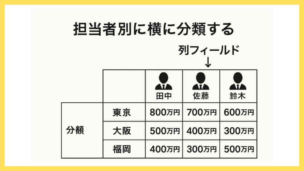 各支店の売上を、今度は「担当者別」にも分けてみます。これが「列で分類する」ということです。