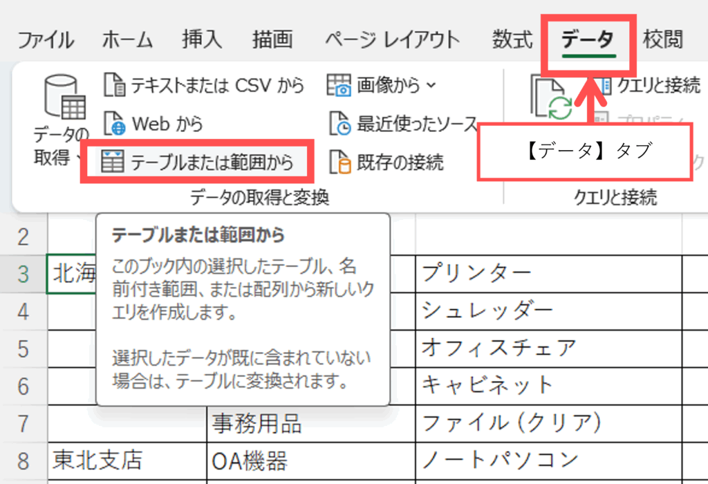 メニューの【データ】タブから【データの取得と変換】グループにある【テーブルまたは範囲から】をクリックします。