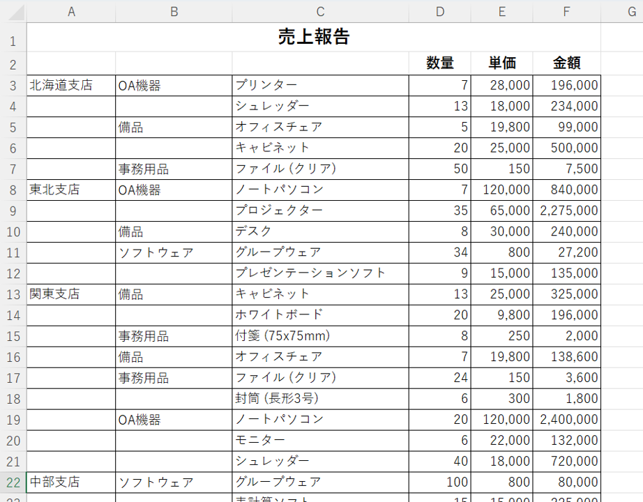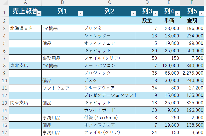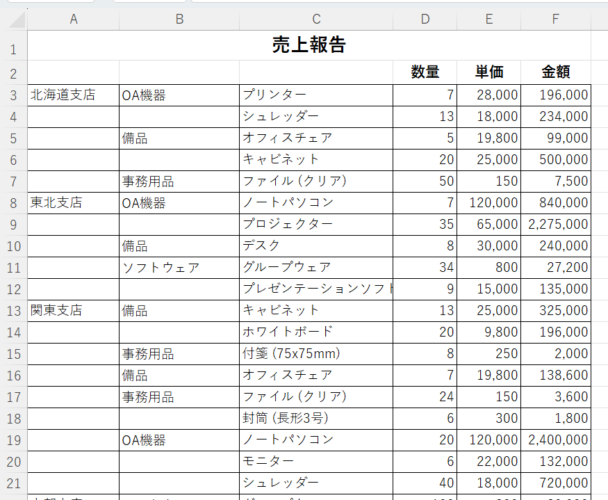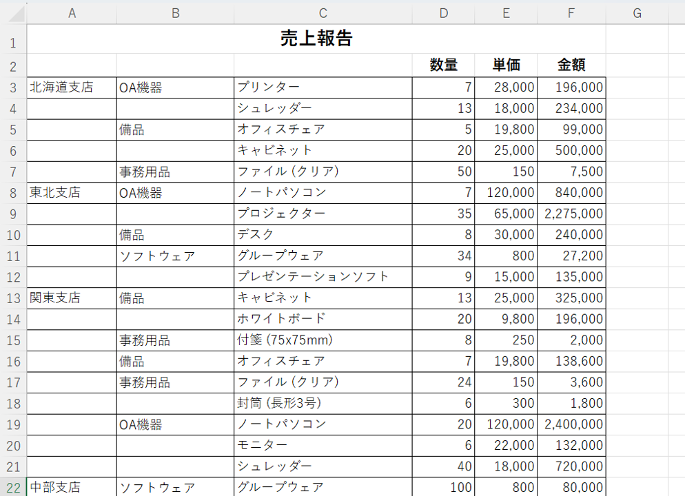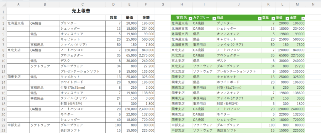 今回行いたい加工は、【支店名】と【カテゴリー名】の空欄を埋めてデータベースの形にすることです。