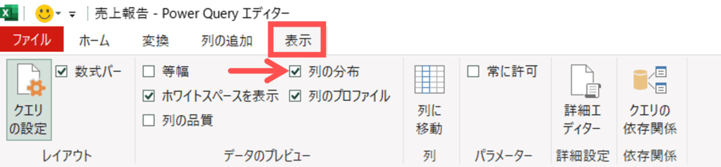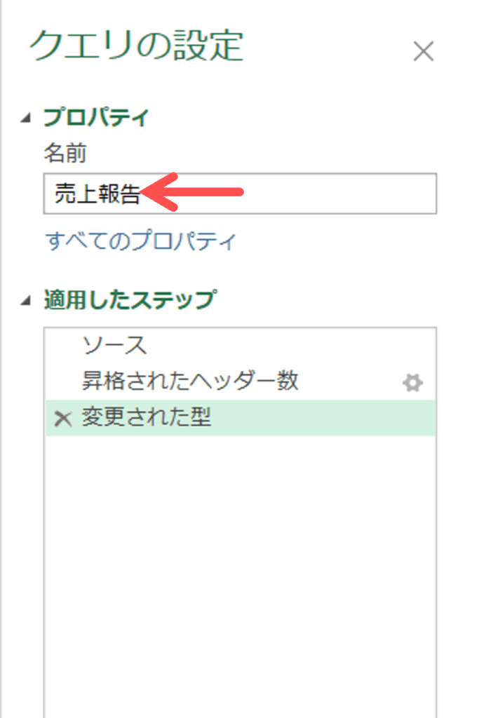 この右側の【クエリの設定】を確認すると、名前ボックスで入力した、【売上報告】になっている事が分かります。