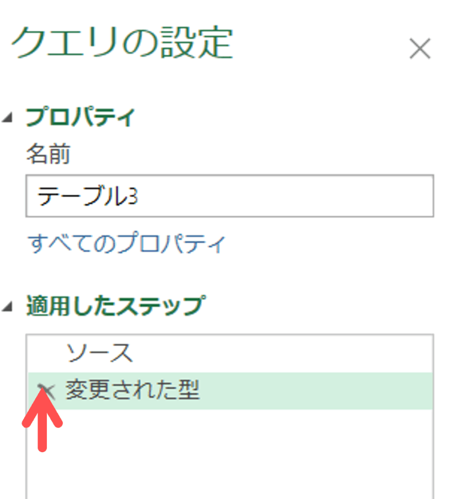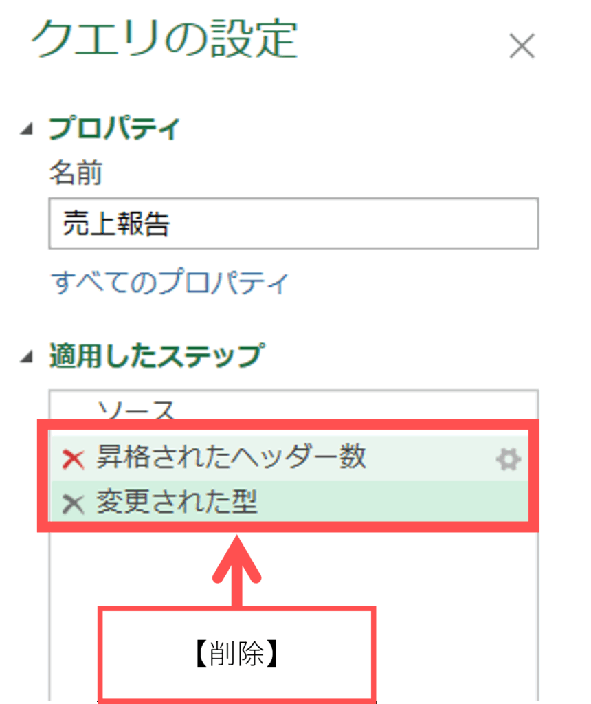 PowerQueryでは【昇格されたヘッダー】と【変更された型】というステップが自動的に登録されています。しかし、今回のデータでは【数量】【単価】【売上】の行を項目名としたいので、これらの自動ステップは削除します。
