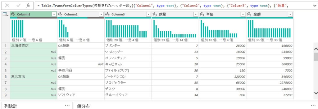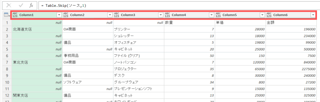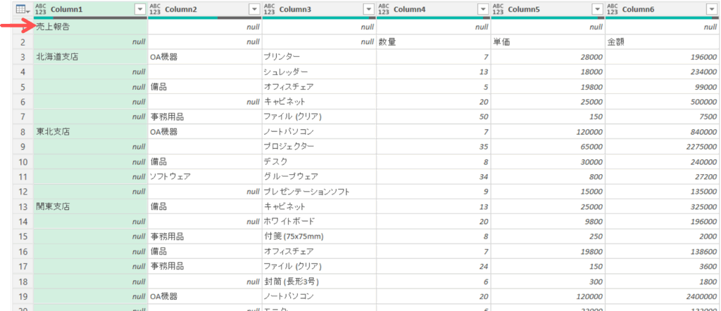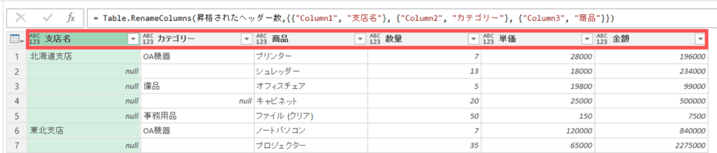 ヘッダーに【数量】【単価】【売上】が設定されます。空欄だった項目は【Column1】【Column2】などと自動で振られるので、ダブルクリックやF2キーで【支店名】【カテゴリー】【商品名】と入力し直します。