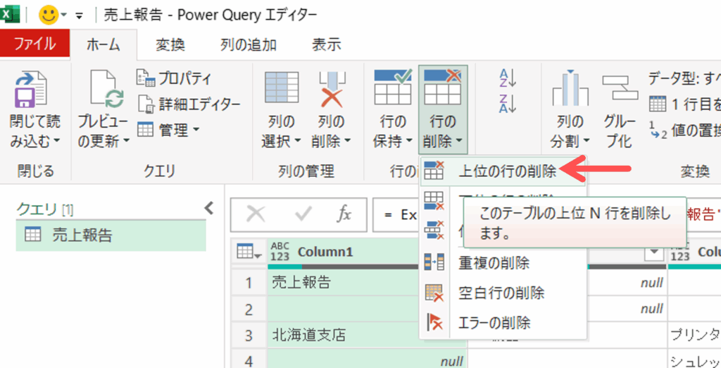 ホームメニューの【行の削除】から【上位の行の削除】を選択します。これは、上から何行分を削除するか?という事です。クリックして選択します。