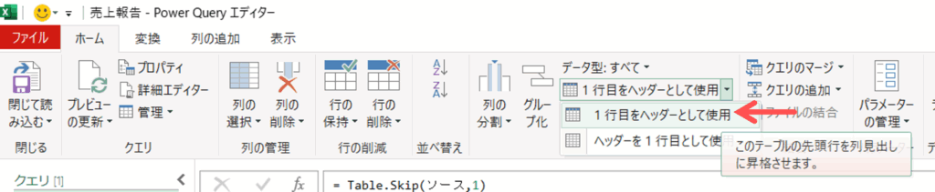 ホームタブの【1行目をヘッダーとして使用】をクリックします。