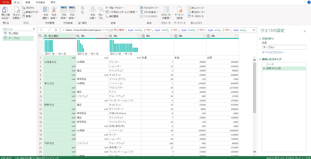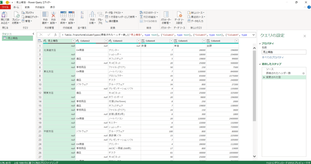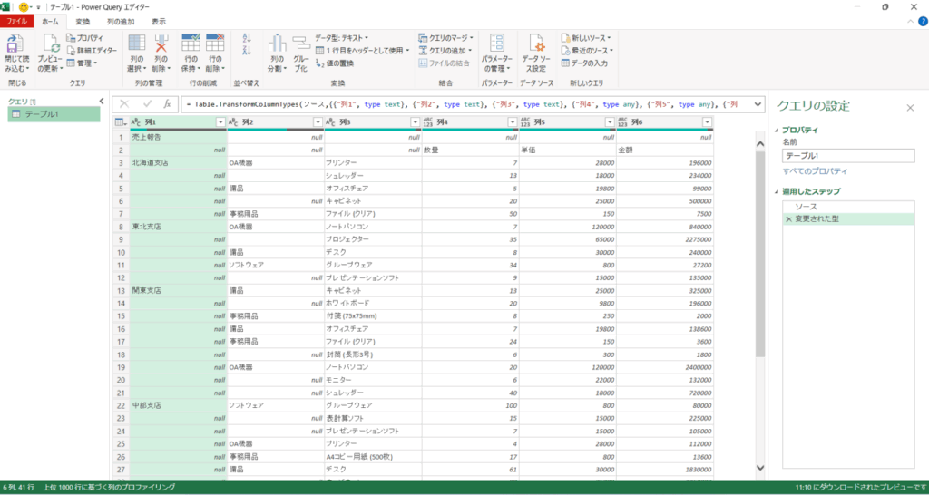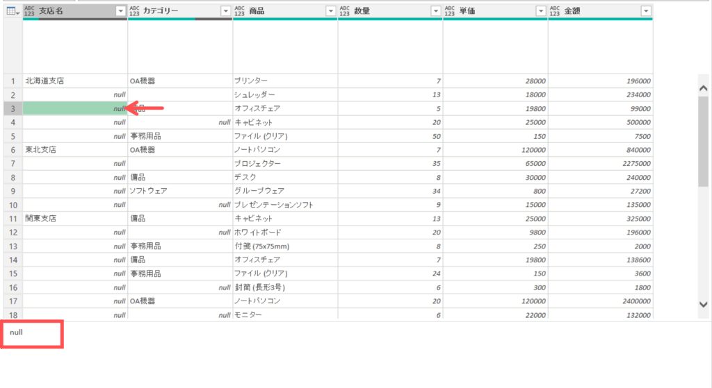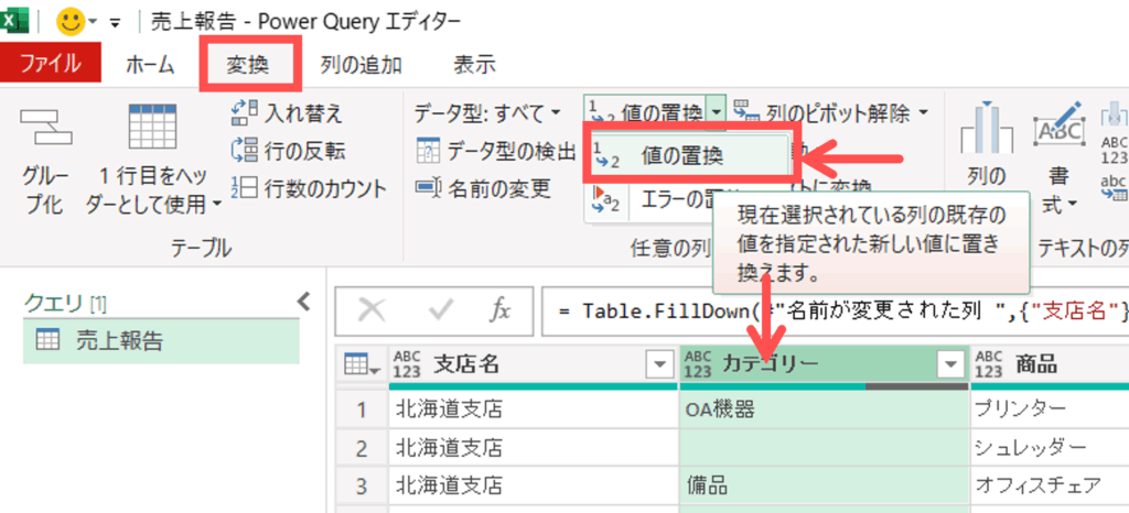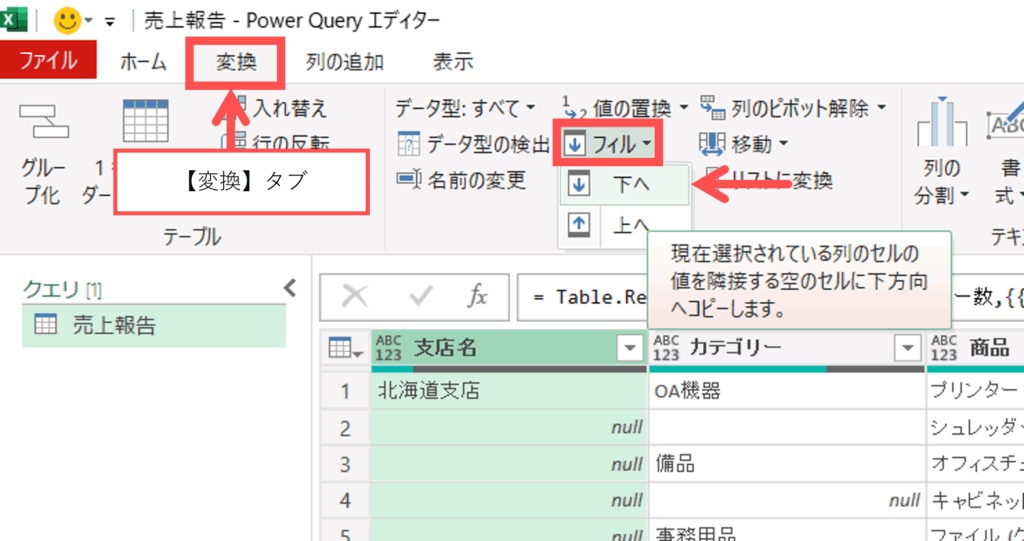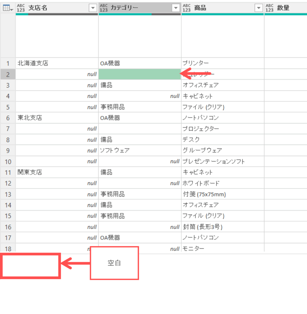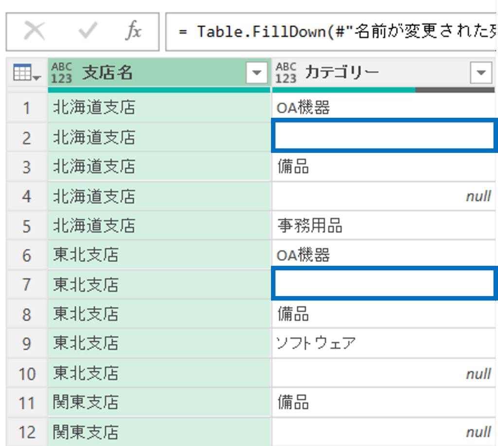 【カテゴリー】列の半角スペースを【Null】に置換し、その後、【支店名】と【カテゴリー】列をフィル【下】で埋めます。