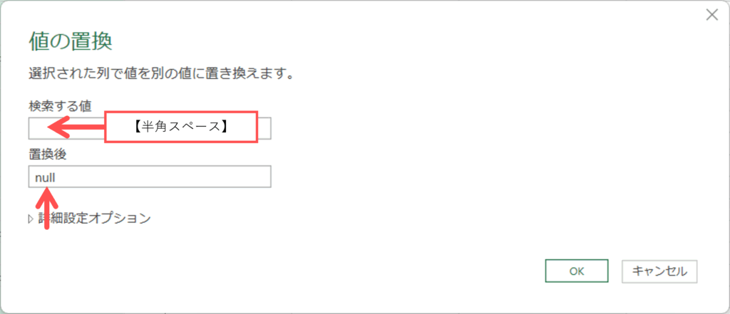 そのため、もう一度【値の置換】を開き、【置換後の値】に【null】と直接半角で入力します。