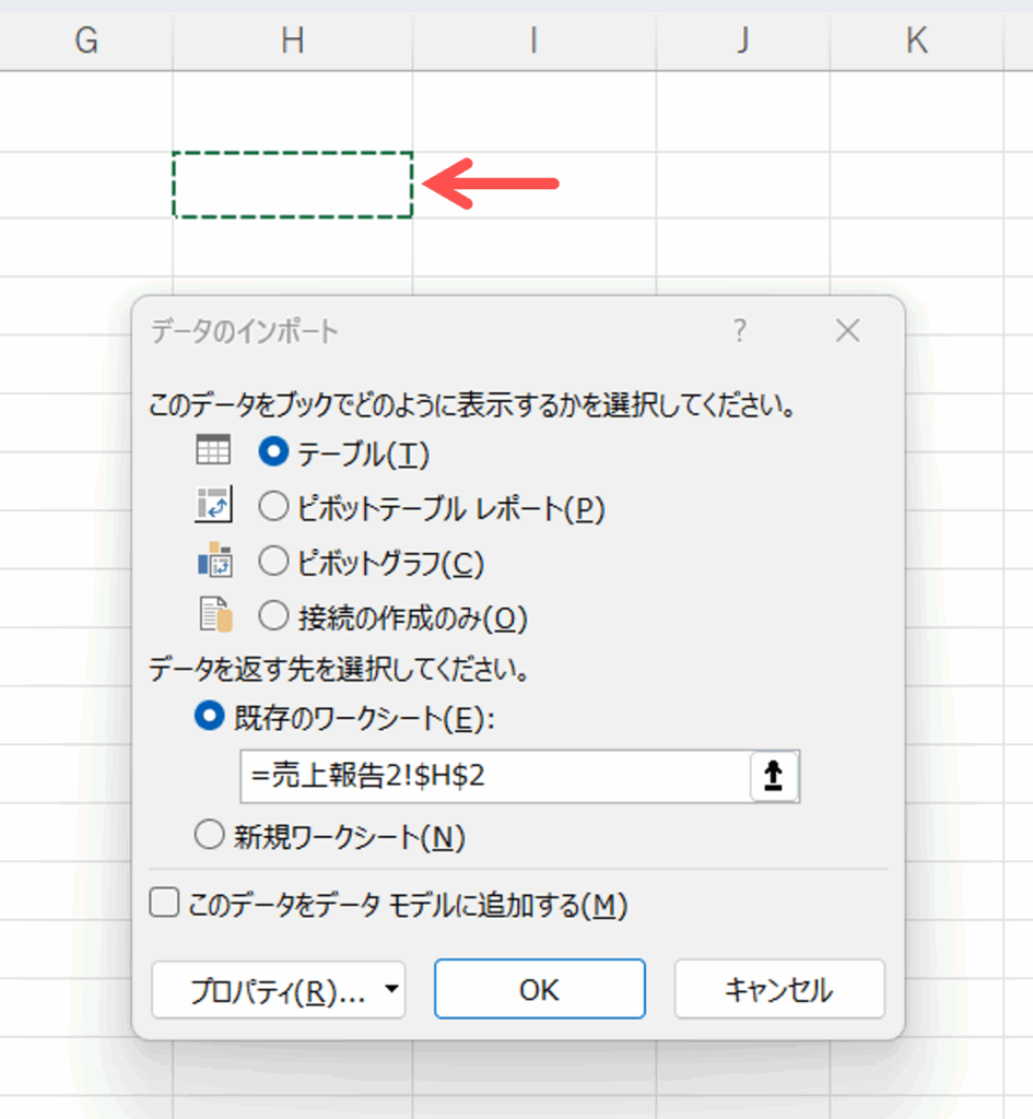 【データのインポート】画面で、【テーブルとして】をチェックし、【既存のワークシート】を選択します。今回は既存のデータの隣(例:H3セル)に読み込みます。