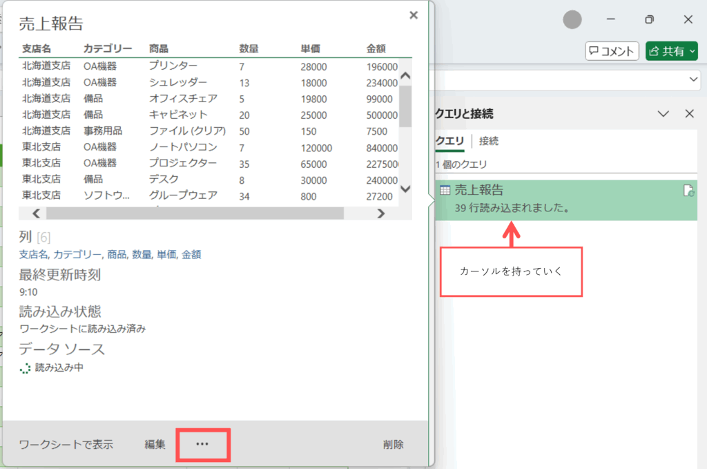 【売上報告】にカーソルを持って行くと、クエリの詳細が表示されるポップアップの一番下にある【…】をクリックし