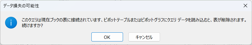 【データ損失の可能性】というメッセージが出ますが、これは元のテーブルがピボットテーブルに置き換わることを意味します。問題ないので【OK】をクリックします。