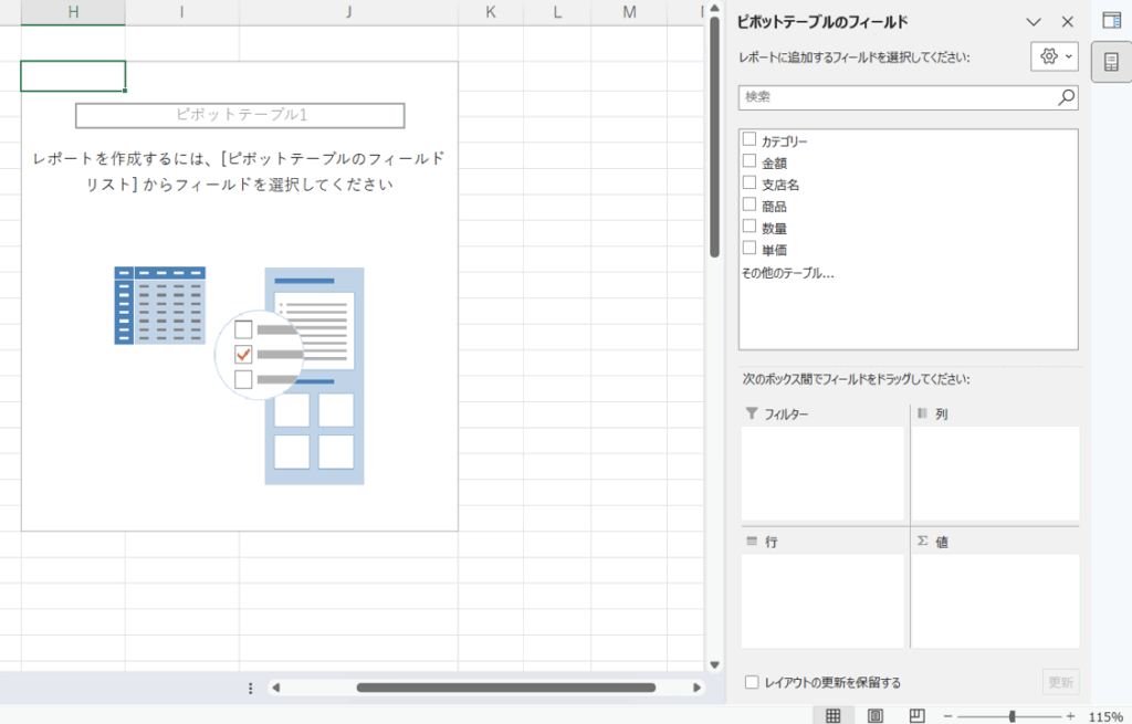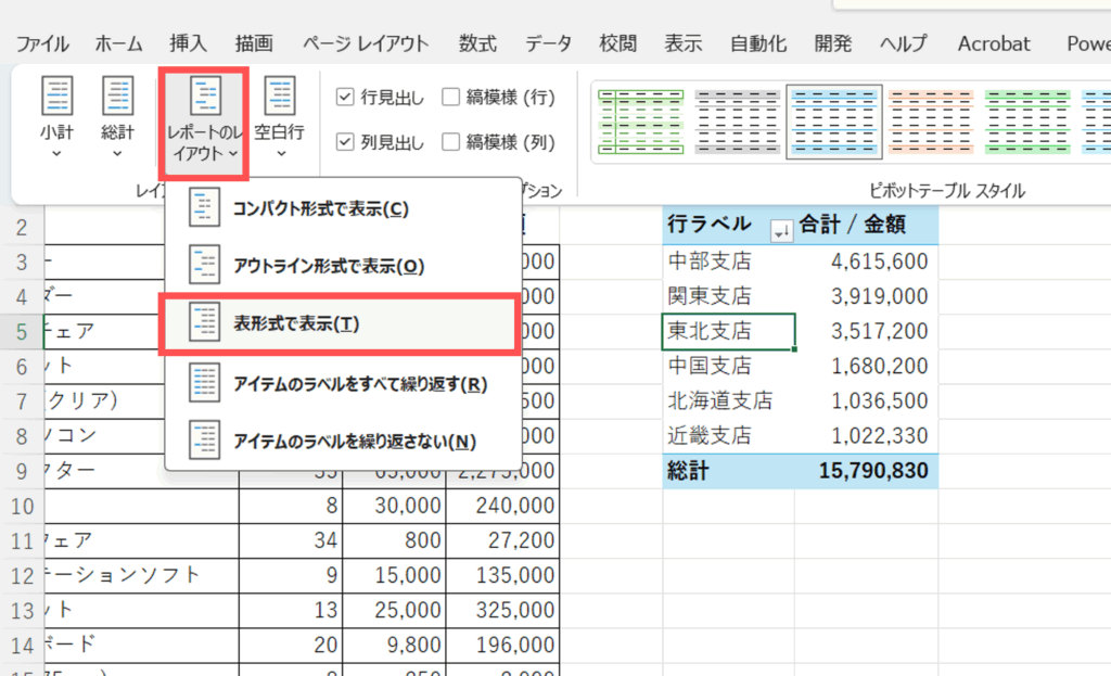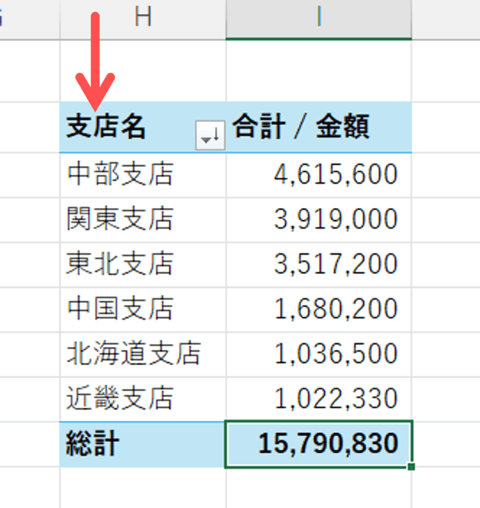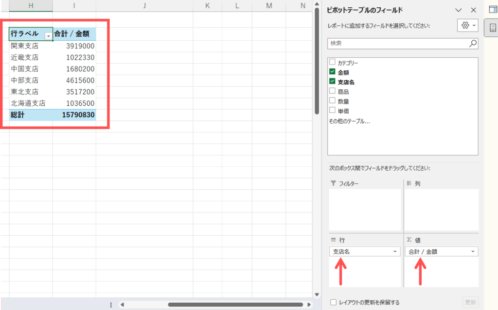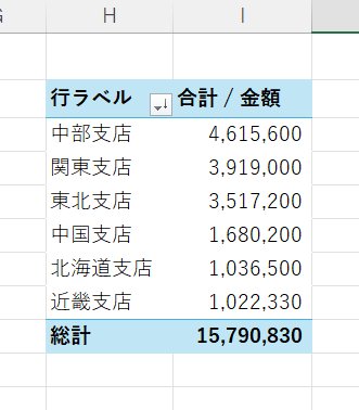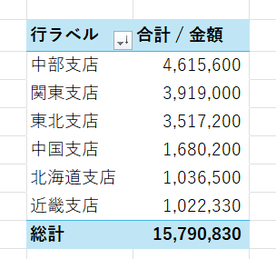 これにより、支店ごとの売上がピボットテーブルで集計されます。