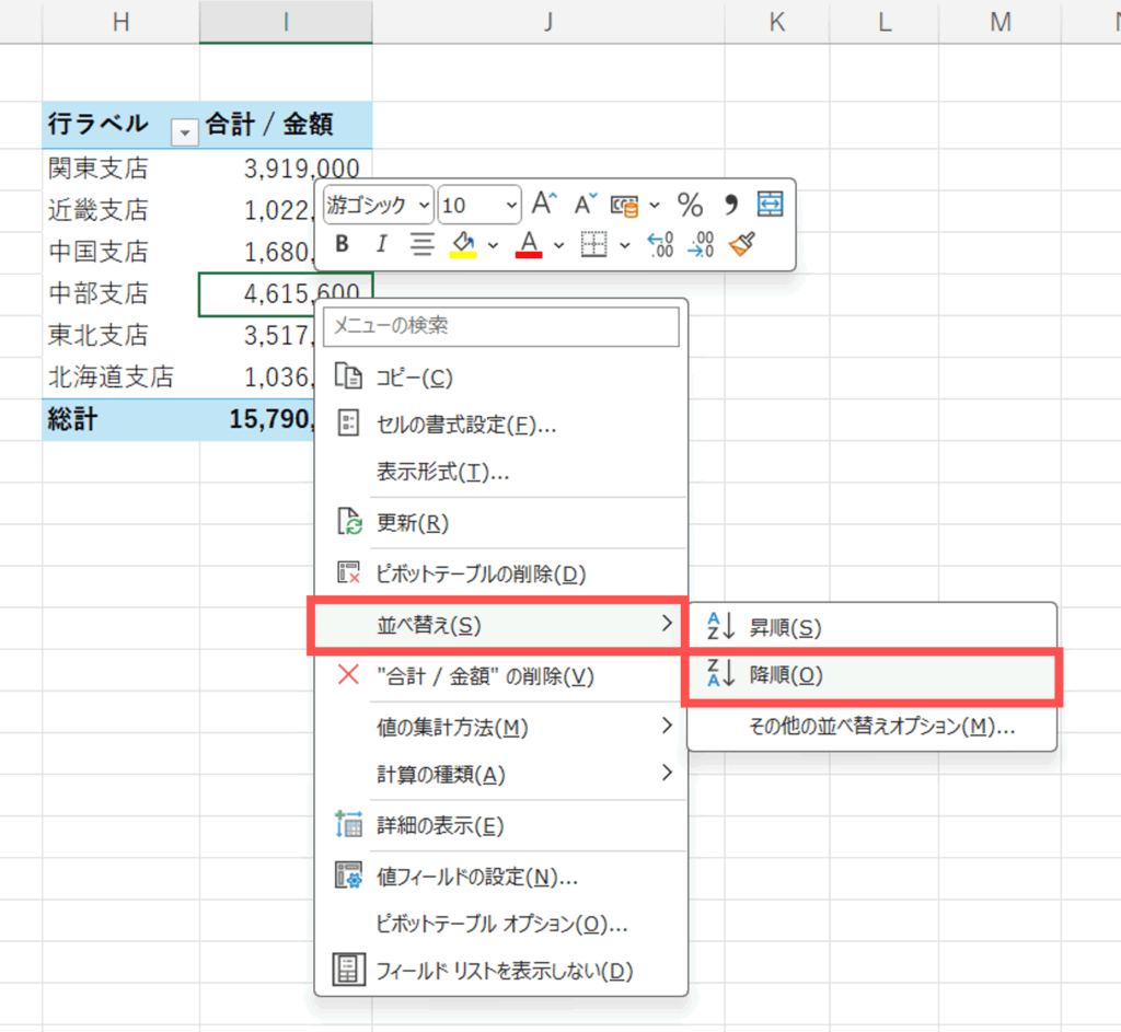 ピボットテーブルを見ると、【四国支店】が一番上に移動し、数字も更新されているのが確認できます。