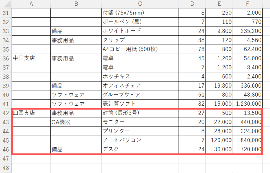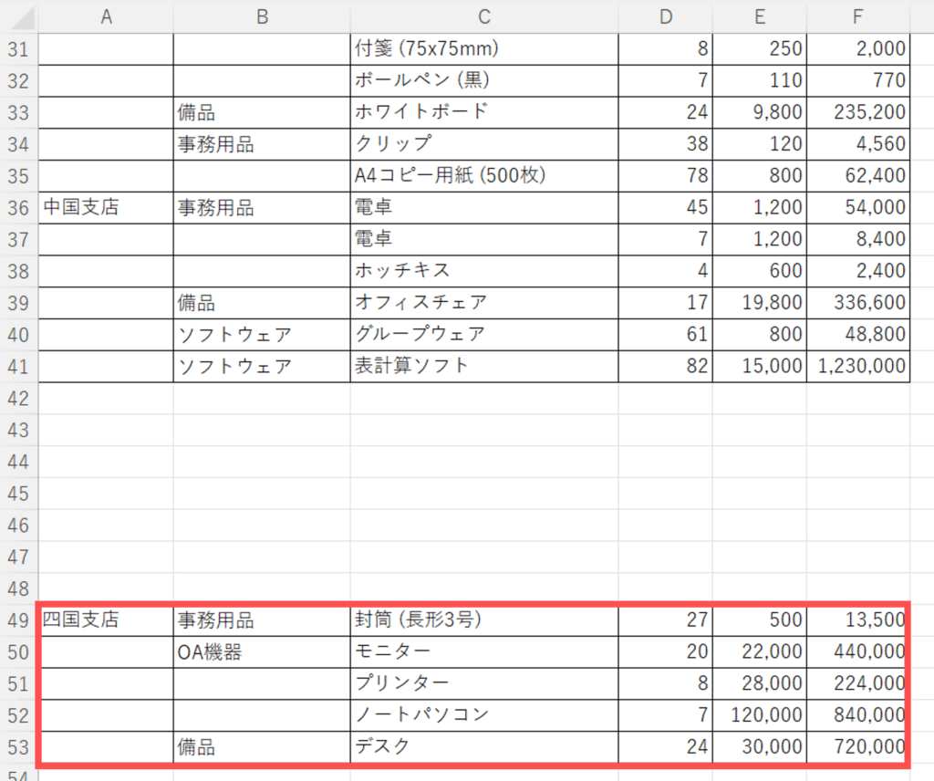 1. 【四国支店】のデータをテーブルの一番下に追加します。
