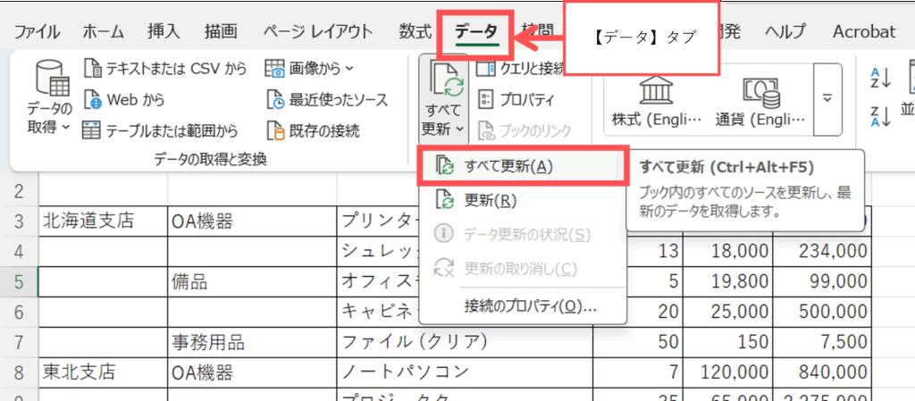 これで範囲が広げられたので、再度【データ】タブの【すべて更新】をクリックします。 すると、【四国支店】がピボットテーブルに追加されたのが確認できます。