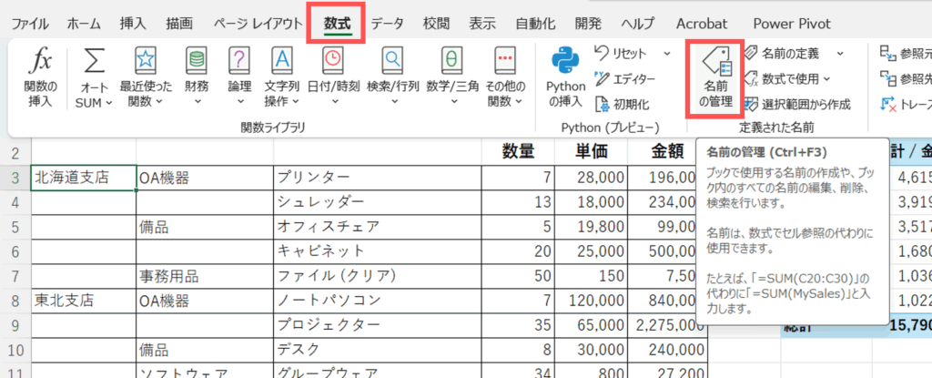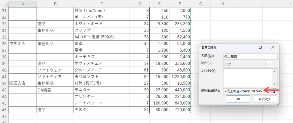 これにより、選択した範囲に名前が付けられます。この名前をクリックすると、いつでもその範囲が指定されるようになります。