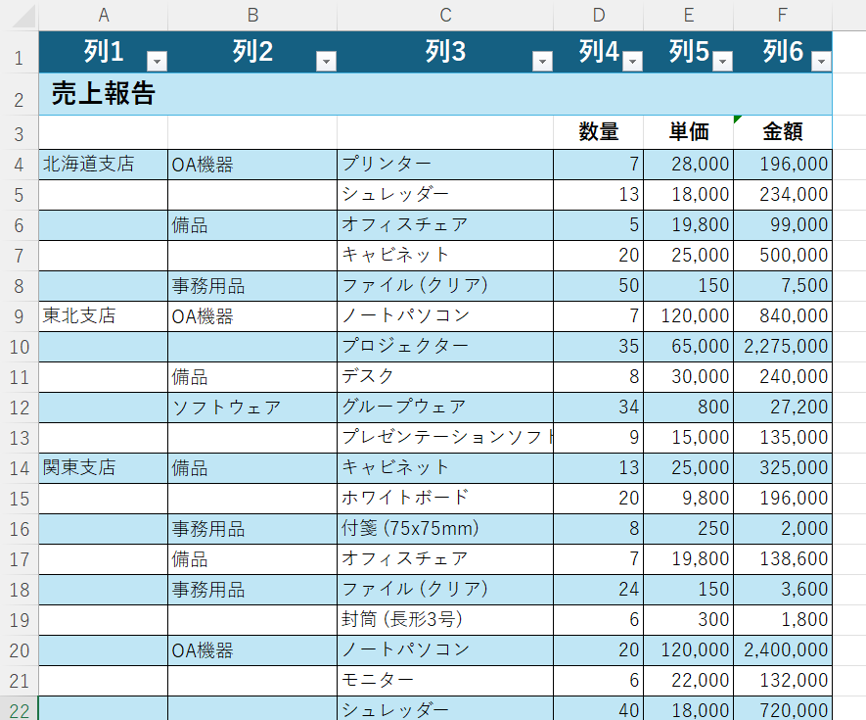 • セルが統合されていた部分【売上報告】は分解され、データは一番左のセルに移動します。