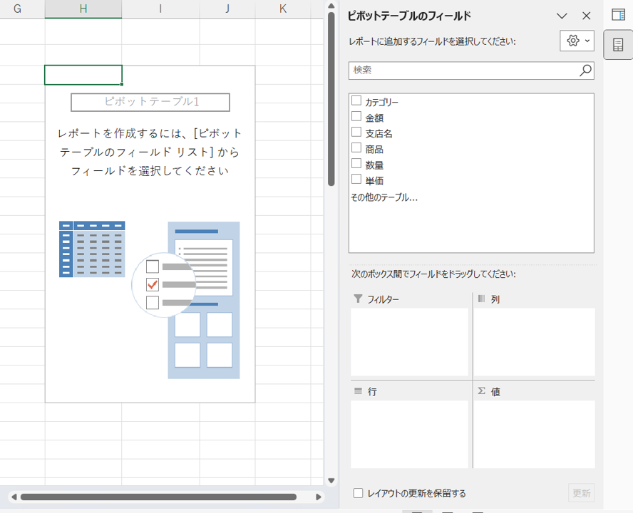 ピボットテーブルのフィールドが表示されるので、集計したい項目を設定します。