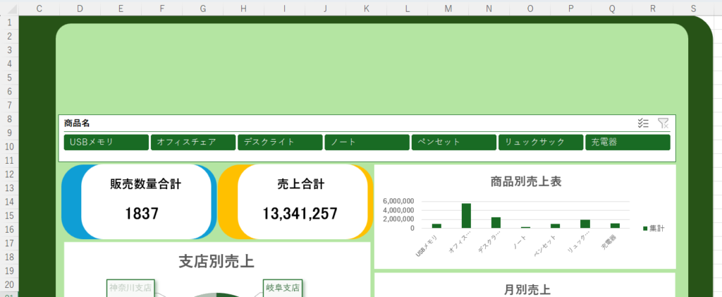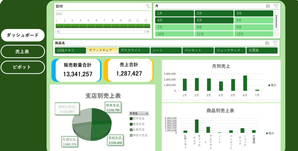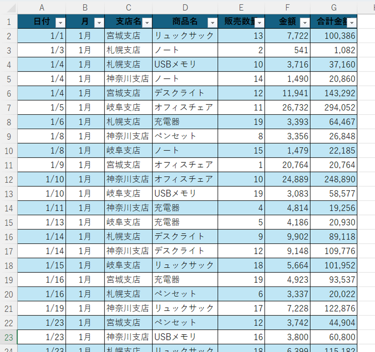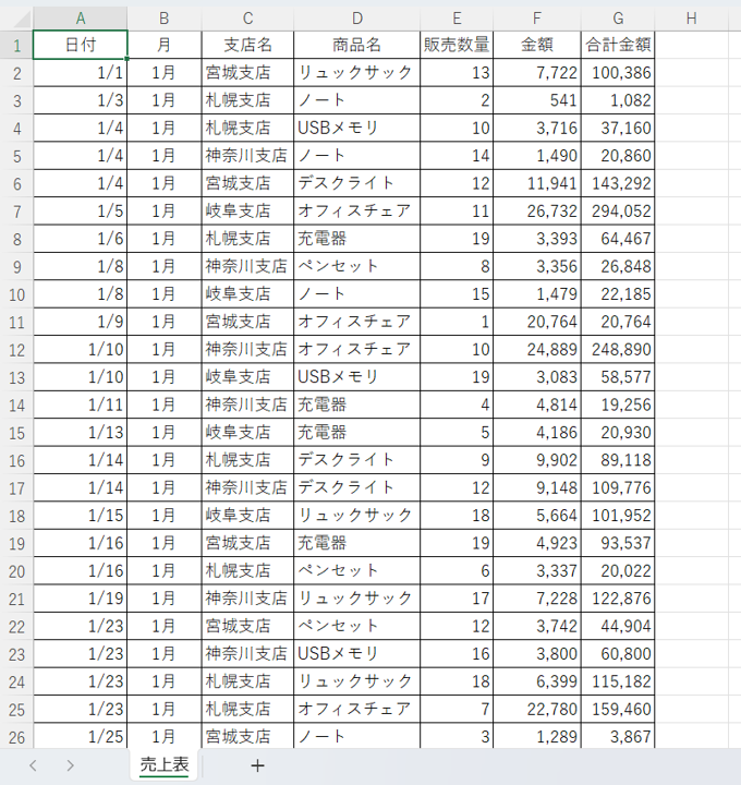 (例:日付、月、支店名、商品名、販売数量、単価、合計金額など)