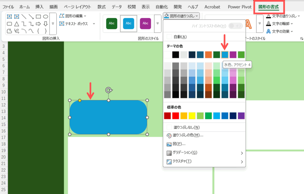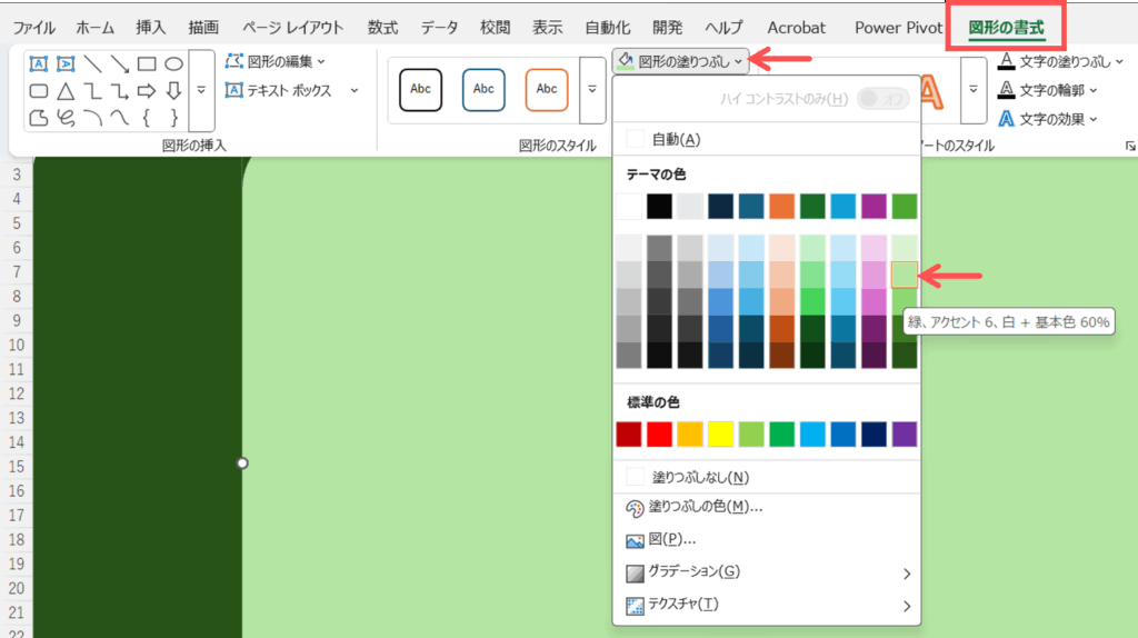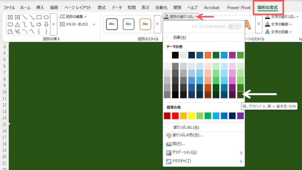 【図形の書式】タブから【図形の塗りつぶし▼】から【緑、アクセント6、黒÷基本色50%】を選びます。