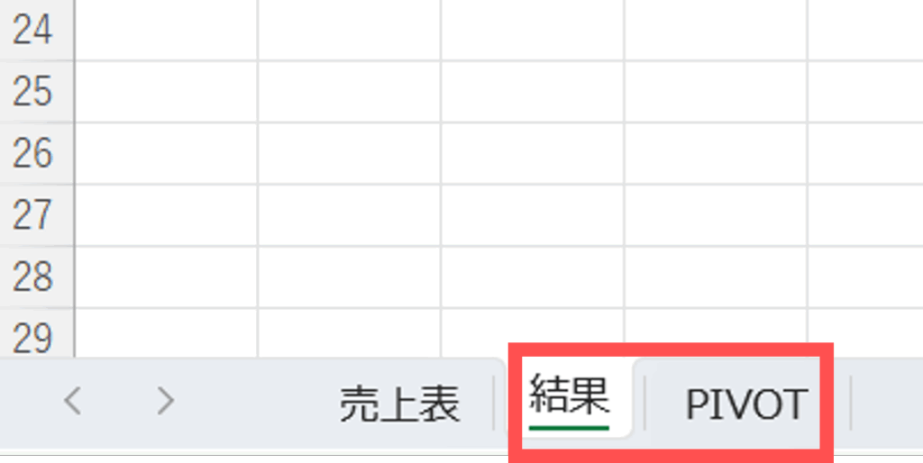 新しいシートを2つ追加し、それぞれ「結果」「PIVOT」と名前を付けます。