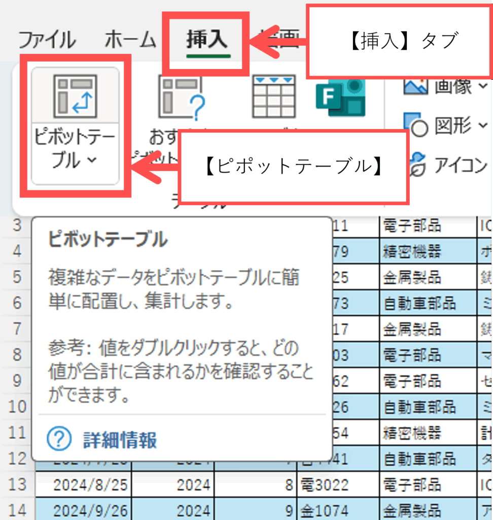 ②【挿入】タブから【ピポットテーブル】をクリックして選択します。