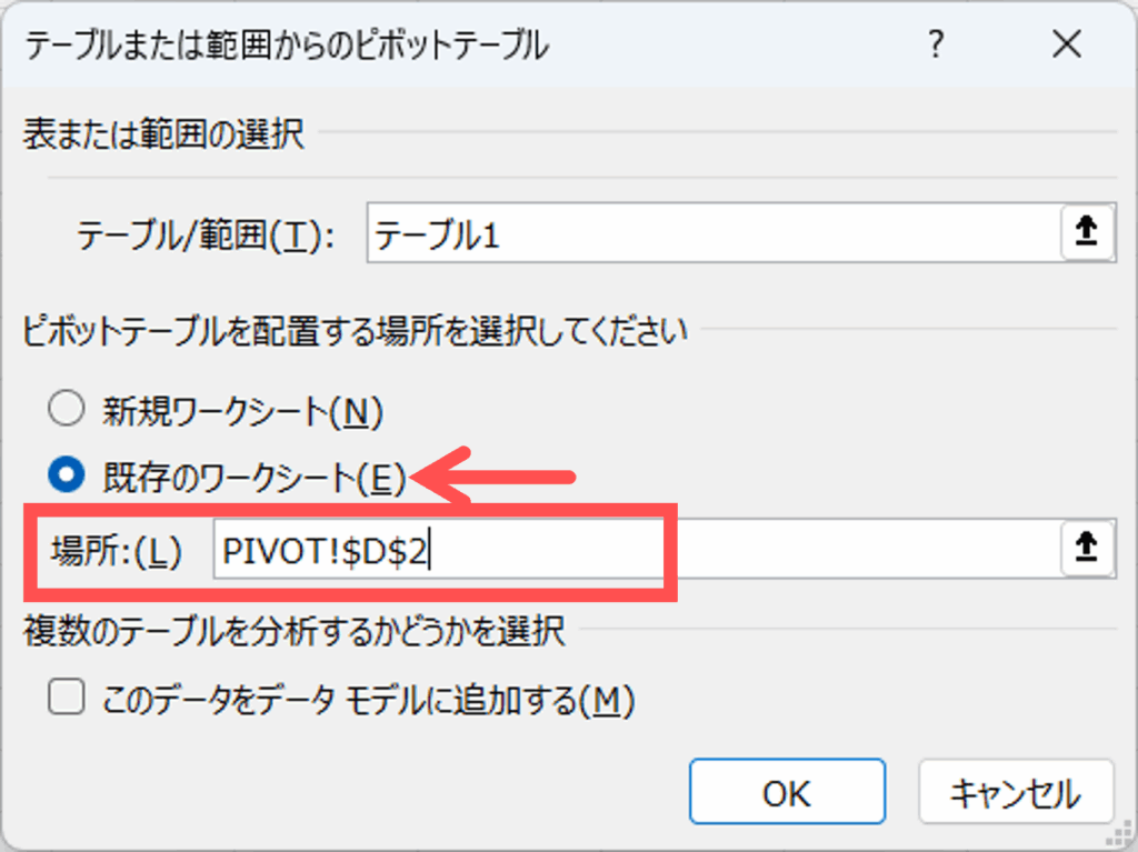 【既存のワークシート】にチェックを入れて、PIVOTシートの【D2】セルをクリックして選択します。