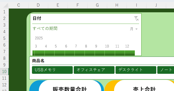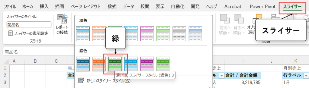スライサーをクリックすると【スライサー】タブが表示されますので、クリックして選択します。スライサーのスタイルは【緑】にします。