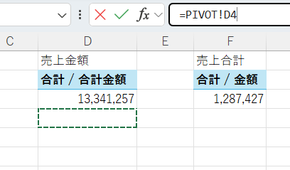 直接セルを選ぶとGETPIVOTDATAという関数が自動入力され、意図通りに連携できないことがあります。その場合は、一度目的のセルのすぐ下のセル(例:D4)を選んでから、数式バーで手動で正しいセル番号(例:D3)に修正する、という方法を試してみてください。