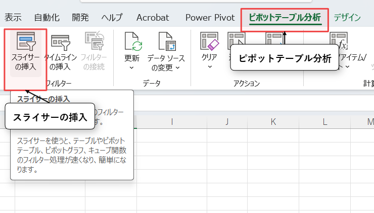 ピポットテーブル内をクリックして、【ピポットテーブル分析】タブから【スライサーの挿入】をクリックして、選択します。
