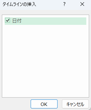 【タイムラインの挿入】ダイアルボックスが表示されます。【日付】にチェックを入れ【OK】ボタンを押します。
