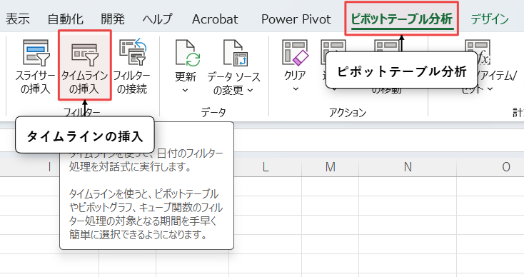 【ピポットテーブル分析】タブから【タイムラインの挿入】をクリックして選択します。