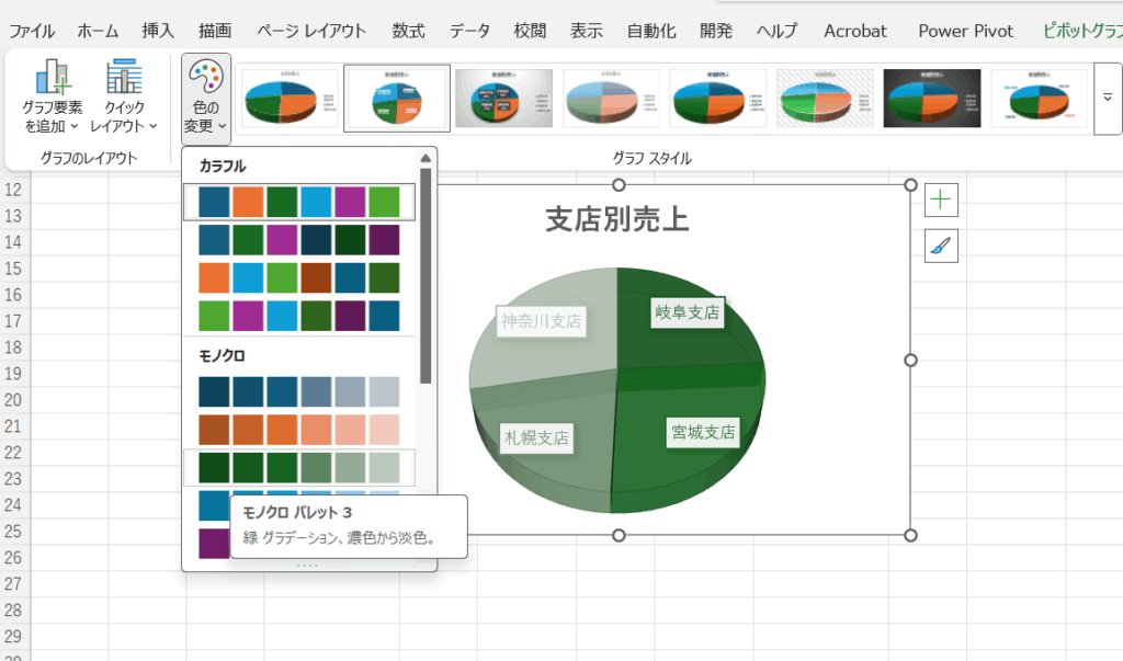 【デザイン】タブからグラフの【デザイン】を変更します。