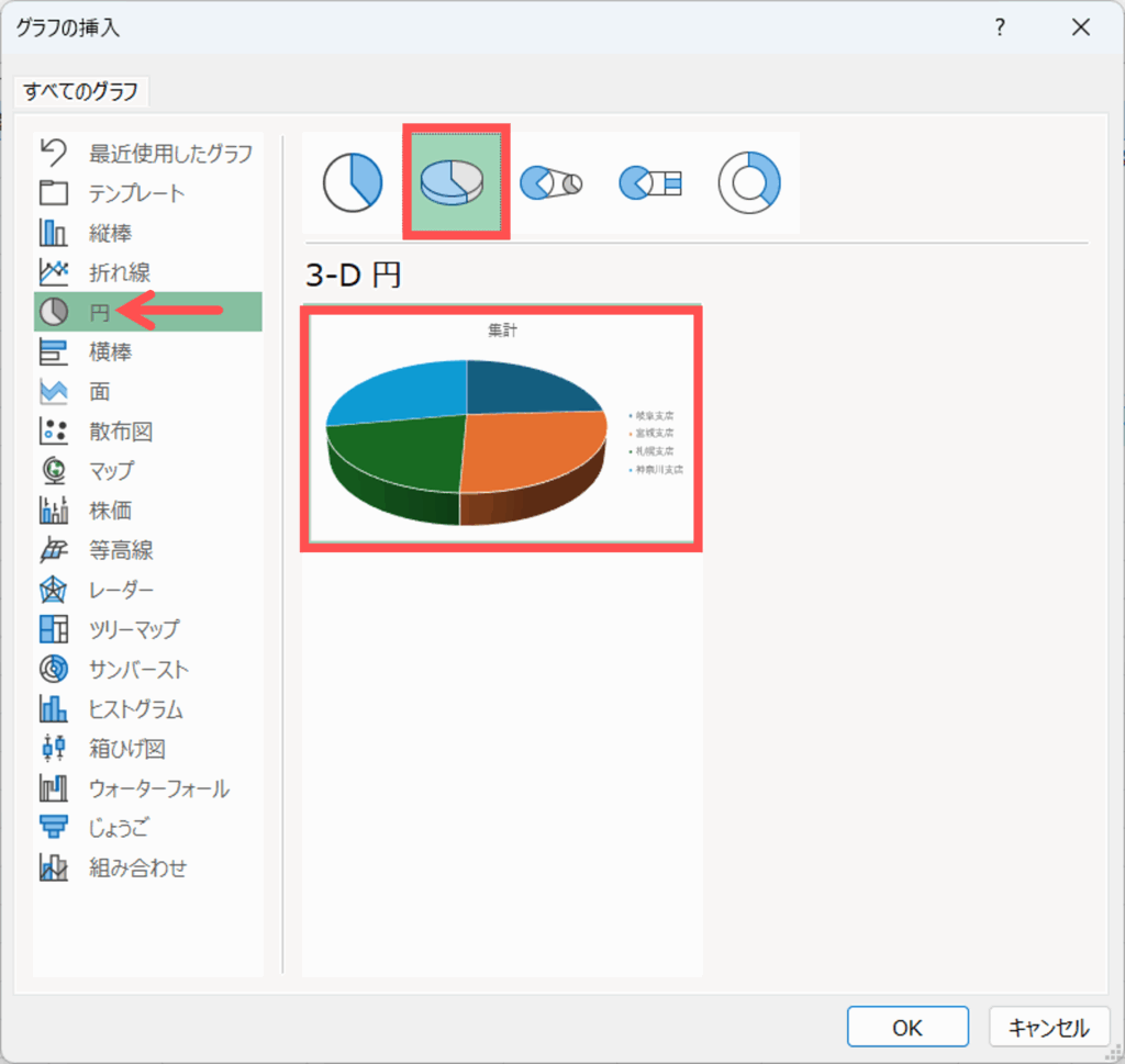 【円】を選択して、【3D円】をクリックして選択し、【OK】ボタンを押します。
