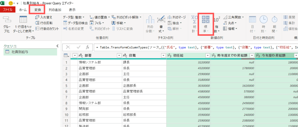 PowerQueryエディターが開いたら、まずは数値データの扱いについて基本的なメニューを確認しておきましょう。
